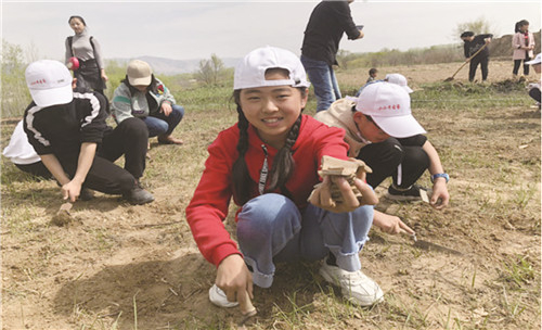 同学们在齐家坪遗址傍的空地上认真的发掘寻找着,一位同学找到了一个陶片,兴奋极了。这是临夏州博物馆开展的“家乡那么美,我想去看看——我是小小考古家”活动现场。
