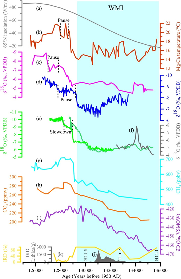 图3 倒二冰消期时全球古气候记录对比。(a)北纬65度夏季太阳辐射。(b)北大西洋深海钻孔ODP976浮游有孔虫壳体Mg/Ca重建的海表温度记录。(c)以色列洞穴石笋记录。(d)河北兴隆洞石笋记录(本研究)。(e)湖北三宝洞(浅绿,深绿)和南京葫芦洞(黑色)记录。(g)(h)(i)分别为南极冰芯Vostok(年代标尺为AICC2012)甲烷浓度,二氧化碳浓度和氘同位素记录。(j)北大西洋深海钻孔980冰筏记录,调谐于三宝洞石笋年代。(k)北大西洋埃里克钻孔MD03-2664冰筏记录,调谐于意大利Corchia洞穴石笋年代。箐色柱(WMI):倒二冰消期内的弱东亚夏季风时段。黑色虚线:末次间冰期开始后的增温暂停“Pause”和气候改善速度减缓“Slowdown”事件