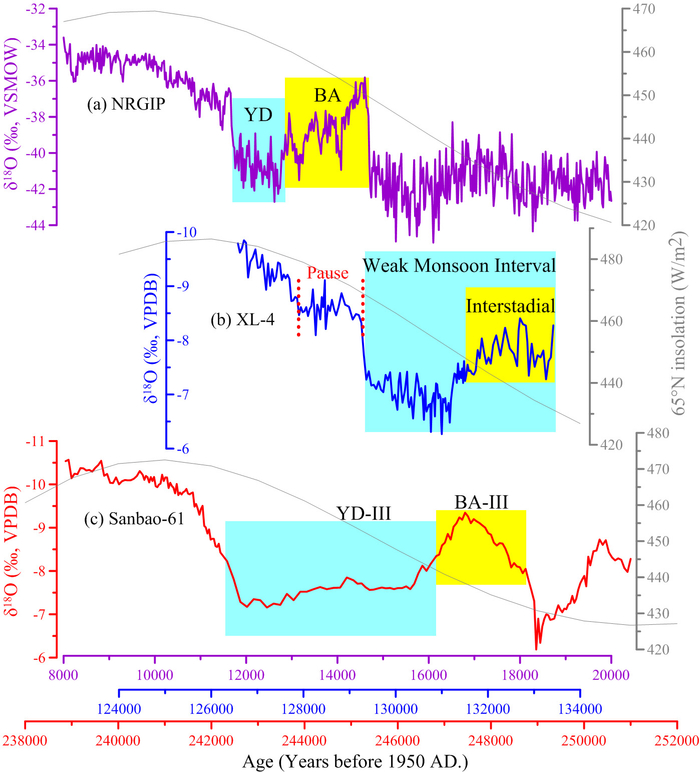 末次冰消期气候持续回暖过程中发生了一个千年尺度的气候快速转冷事件,即新仙女木事件,中国南方石笋记录显示倒三冰消期也发生了类似的降温事件,但倒二冰消期到底有没类似的气候转冷事件仍然存在较大争议。他们研究发现华北石笋XL-4记录在末次间冰期开始后,出现了一个千年尺度的δ18O波动事件,对应于中国南方石笋δ18O负偏变率减缓事件(图2,图3)。一些北大西洋记录在该时段也出现了一个类似的增温暂停事件(图3)。不过,他们认为由于该事件变化幅度较小且发生于末次间冰期开始后,因此并不能类比于末次冰消期时的新仙女木事件。与末次冰消期和倒三冰消期相比,倒二冰消期时,北半球高纬夏季太阳辐射更强(图4),大气二氧化碳浓度更高,从而引起冰盖更早更快的消融,使更多的淡水注入北大西洋,进而严重抑制了温盐环流,甚至在末次间冰期刚开始时仍然没有完全恢复。因此,他们推测末次间冰期开始后的淡水注入并不能引起没有完全恢复的温盐环流显著减弱,所以没有形成像新仙女木事件这种大的降温事件,而是仅仅引起了短暂的增温减缓或停滞。