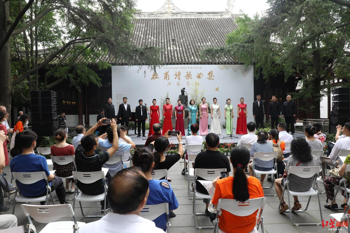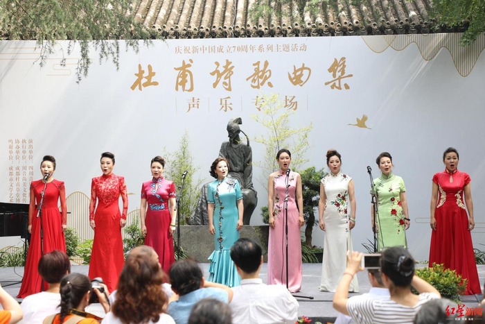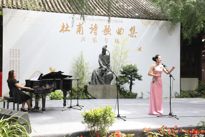 6月21日上午,杜甫草堂大雅堂琴声悠悠,乐音婉转,庆祝新中国成立70周年系列活动之“且诗且歌,诗韵千古”杜甫诗歌音乐会诗意呈现。