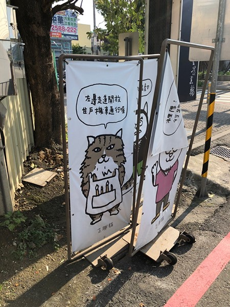 如今漫步在正兴街上,随处可见正兴猫的身影。在入口处,有几个画着正兴猫的立牌,上面写着交通提示标语,诸如“左边走道开放,住户机车通行哦”,牌子下连着可以滑动的木板。