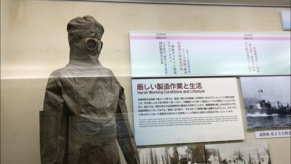 这里保存了许多与“毒气工厂”相关历史资料,还有当时人们制造毒气时穿戴的防毒面具、防毒服,废弃的毒气罐等。在资料馆后面有一个教室,教室四周的墙壁上挂着许多“毒气受害者”的照片,这些受害者中不但有侵华战争中受日军化学武器毒害的中国老百姓,还有当年参与搬运和处理毒气而被感染的日本村民等。