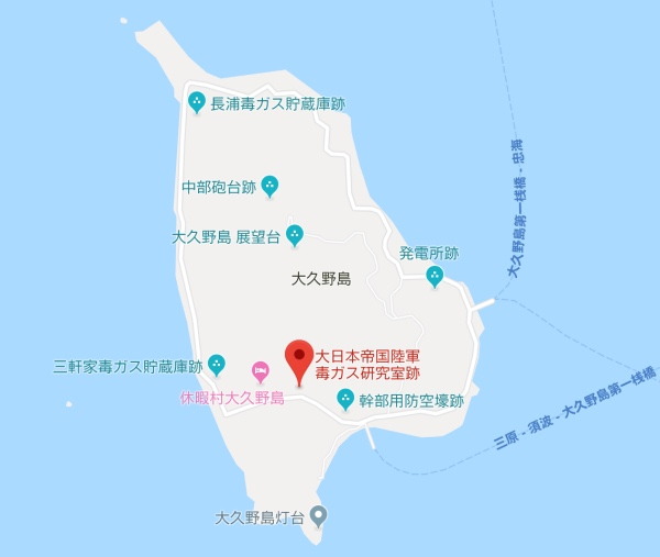 如果在大久野岛上打开手机地图app,你会发现许多“非常刺眼”的名字出现地图上,“大日本帝国陆军毒气研究室遗址”、“三轩家毒气储藏库遗址”、“长浦毒气储藏库遗址”,还有发电厂,炮台遗迹和防空战壕的遗迹标志等等。