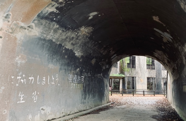 有意思的是,在进入发电厂遗址时,要穿过一个像防空洞一样的通道,通道内侧的墙壁上赫然写着四个大字“吸烟许可”。旁边有一条奇怪的标语: “让我们一起合作吧!”下面还有“厚生省”三个大字。