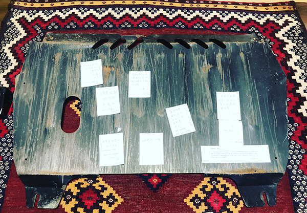 最后,她带着记者来到了唯一的地面展台,可以说,这是全场最“宏大”的一件展品。铺在细腻的克里姆地毯上的是俄罗斯人为夫妇俩制造的底盘装甲,它也是一个独一无二的旅程纪念物,观众能看见58000公里的道路碰撞的痕迹。同时,观众可以把自己的观展想法写下来贴在上面,和夫妇俩一起完成一件新的展品:关于穿越亚欧的旅程感受。