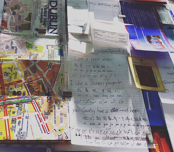加油票、登陆许可、过境单、修车票、景点门票……在一众数字票据里,那张写有中文的笔记本纸分外引人注目,想必一定有个故事。