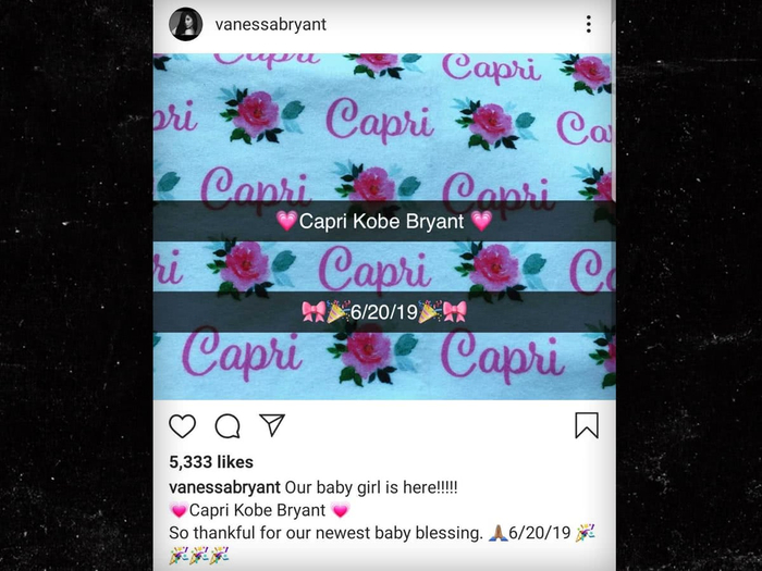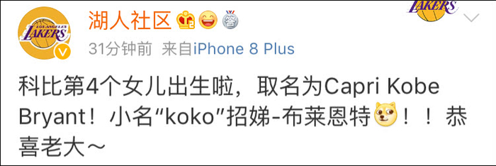 “我们的小女儿降生了!”瓦妮莎公布了孩子的名字,中间名就叫“科比”,“她叫卡普里·科比·布莱恩特(Capri Kobe Bryant)。”