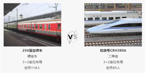 25G型空调车硬座一节车厢比CRH380A二等座多33个坐席;复兴号CRH400AF二等座定员90人,比和谐号多出5个席位。