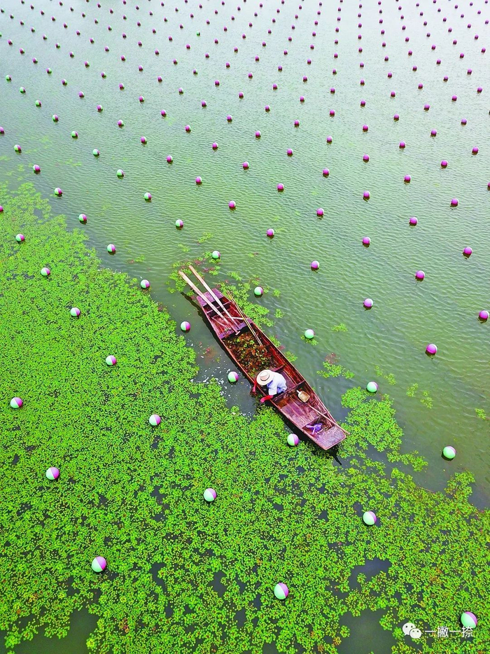 江苏省淮安市洪泽区老子山镇,利用水域广阔的地理优势,开展珍珠蚌养殖。目前,全镇养殖面积达到550亩,养殖数量达100余万只,在发展生态经济中带动当地渔民致富。图为老子山镇珍珠蚌养殖基地的工作人员正在清除水草。万震 摄