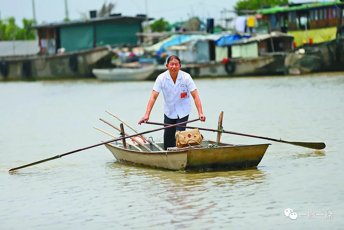 在江苏泗洪县半城镇穆墩岛村,乡村医生李绍友33年来以船为家,在洪泽湖上守护着周边渔民的健康。图为李绍友摇着小船出诊归来。许昌亮 摄