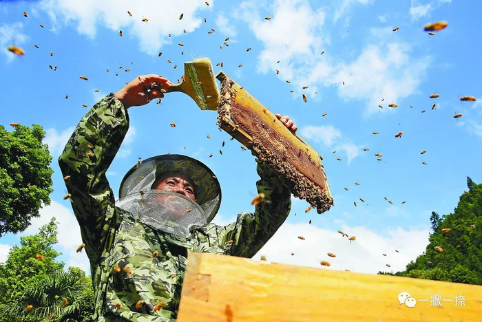 广西柳州市融水苗族自治县汪洞乡罗洞村,蜂农们忙着采割夏至蜜,夏至蜜是夏至时节采割的蜂蜜,它和冬至蜜是一年中质量最好的蜂蜜。汪洞乡罗洞村山里人合作社27户人家在九万大山悬崖上悬挂了1700多个蜂箱,年产优质百花崖蜜近4000公斤,户均年增收1万多元。图为6月20日,村民汪安仕在悬崖上采割夏至蜜。龙涛 摄