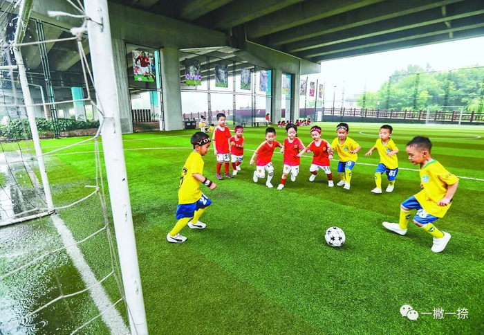 浙江省宁波市镇海区骆驼街道在小城镇综合整治中着力改善民生,使用“以用代管”模式,将桥下空间利用与城市功能区配套充分融合,把原来脏乱差的旧空间打造成一个崭新的惠民工程。图为6月19日,小朋友在高架桥下改造的球场踢足球。章勇涛 摄