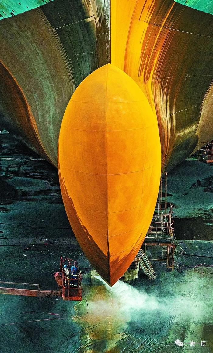 日前,中船南沙文冲船坞修船工在船头喷漆。文冲船坞坐落于中国三大造船基地之一的广州市南沙区龙穴岛。文冲船坞拥有20万吨级和30万吨级船坞各一座,码头1800米,曾完成“探索一号”科考船等项目的改装。王美燕 摄
