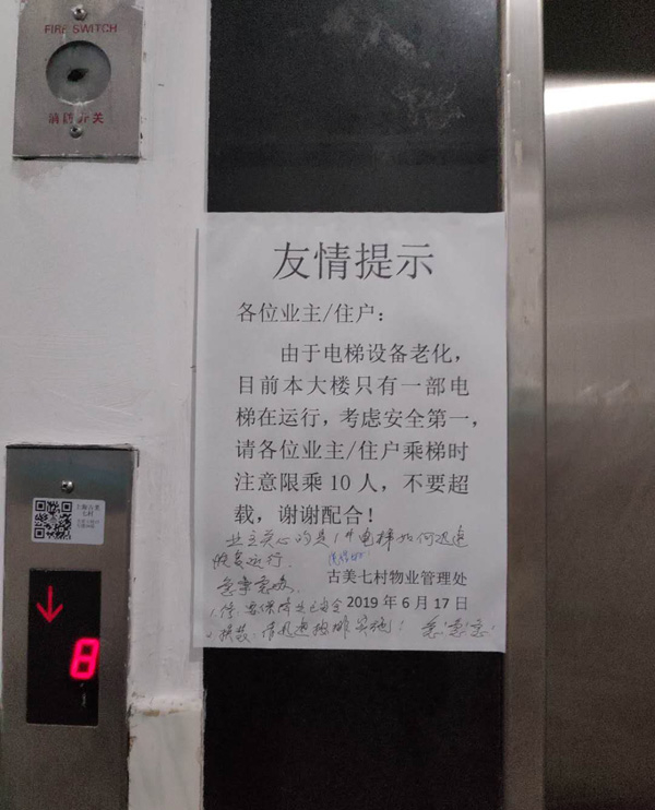 物业张贴提示,电梯设备老化,限乘10人。
