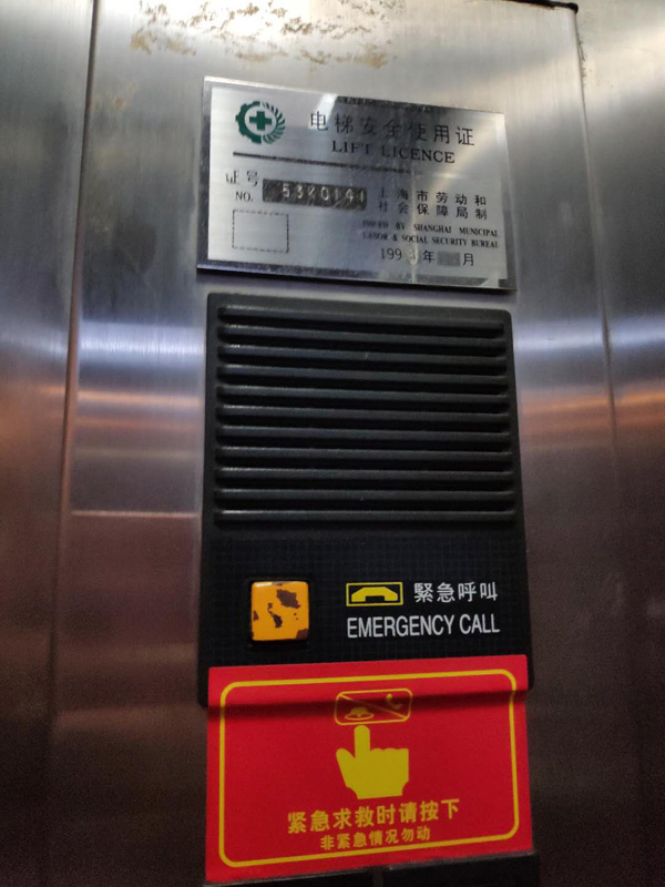 在电梯轿厢按键上部,可见金属材质的“电梯安全使用证”铭牌,上有“1998年□月”字样。另外,电梯内还贴有“特种设备使用标志”,下次检验时间为2019年7月。