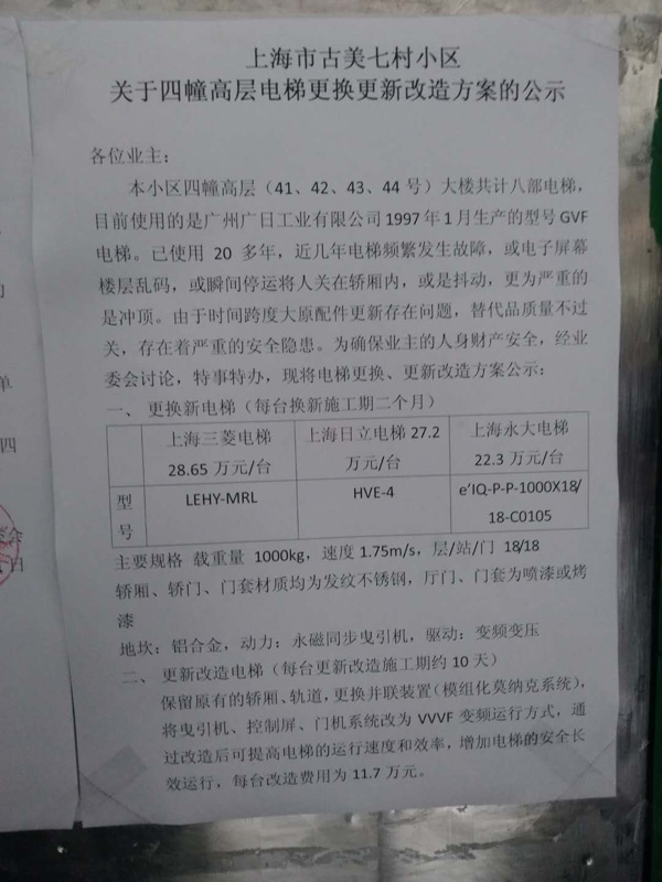 根据该《公示》,更换新电梯方案中,每台电梯需要2个月施工期,待选的3种品牌电梯,价格在每台22.3万元到28.65万元间不等。改造(大修)报价约为11.7万元,工期约每台10天。公示中还有一条,“方案均须有单幢楼专有部分建筑面积2/3和业主户数2/3同意方可实施。”