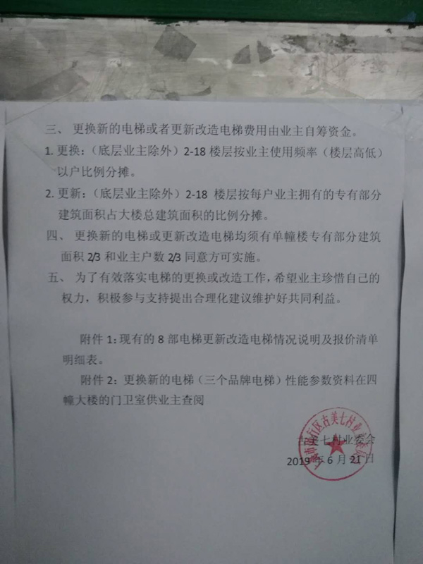 6月21日,记者看到,由业委会制定的《关于四幢高层电梯更换更新改造方案的公示》已在小区张贴。