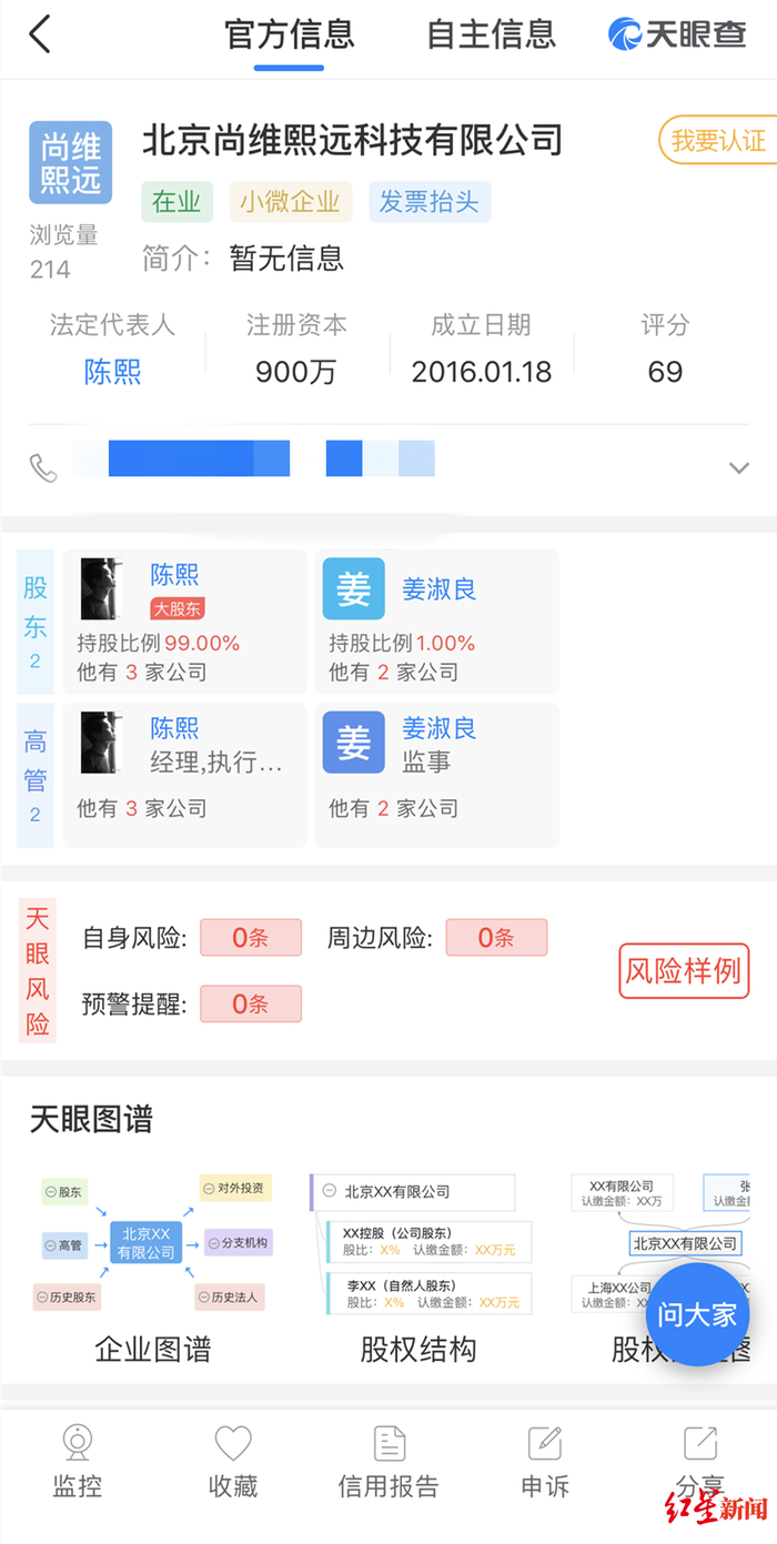 红星新闻记者查看“影漫小天使”公众号后发现,该公众号主体为“北京尚维熙远科技有限公司”。红星新闻其工商信息后发现,其公司法人为陈熙,疑为上述文章的作者。