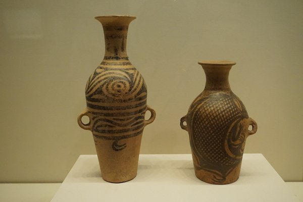 长颈双耳彩陶瓶与鲵鱼纹彩陶瓶 仰韶文化石岭下类型 甘肃省博物馆藏