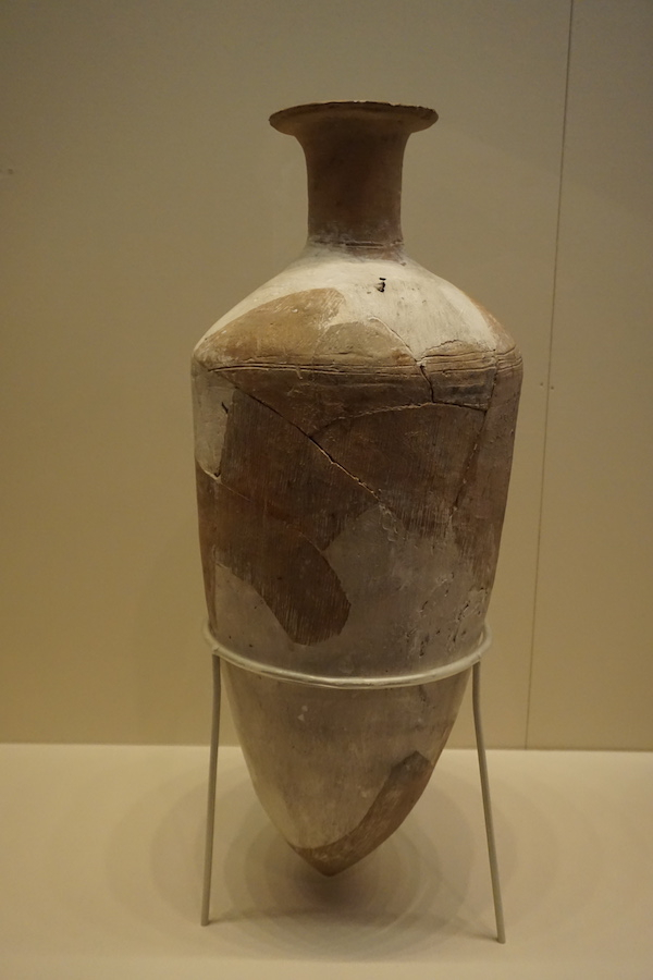尖底陶瓶是大地湾先民常用的一种水器,造型奇特优美,瘦长的尖底可以直接插入土中,也方便取水用。