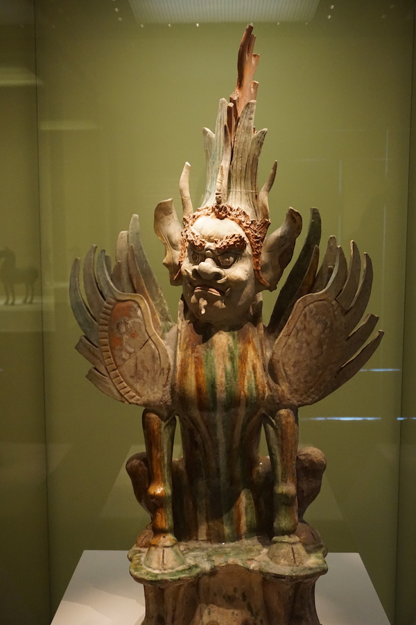 三彩镇墓兽 唐墓中出土了很多这样造型奇特诡异的镇墓兽(狮子形状,带翅膀)很可能吸收了西方造型元素的影响。