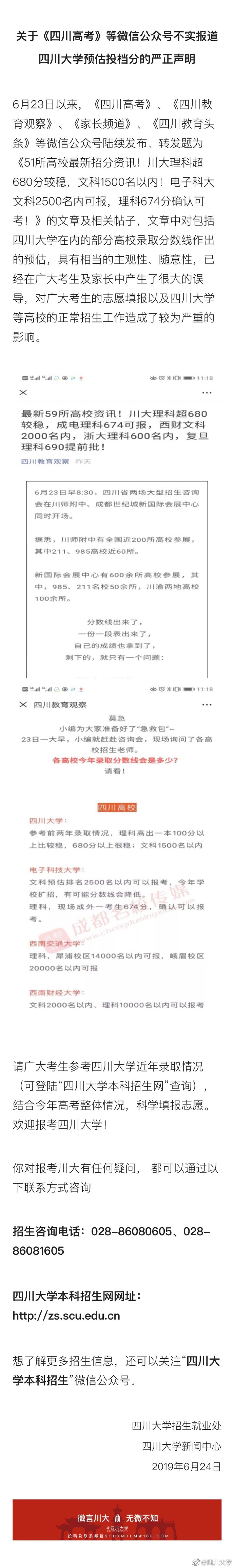 6月24日,四川大学在其官方微博发布关于《四川高考》等微信号不实报道川大预估投档分的严正声明。