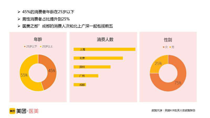 这其中,有45%的消费者年龄在25岁以下;更多男生开始尝试医美,男性消费者占比提升到25%;“医美之都”成都的消费人次和北上广深一起包揽前五。消费数据透视出这届爱美的年轻人更青睐轻医美、爱囤货、勇于尝试。