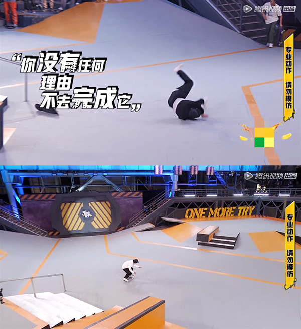 滑板的观赏性,一方面体现在这项运动的一些超高难度的技巧性动作上,只是因为这些动作完成得很快,精彩转瞬即逝。这就需要节目在剪辑上花费功夫,有所取舍,将精彩分解并稍作停留,让视听语言震撼人心。
