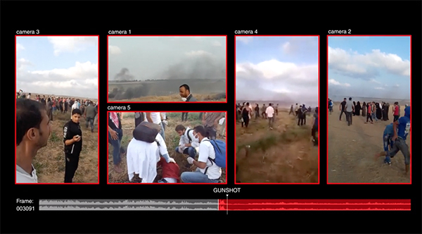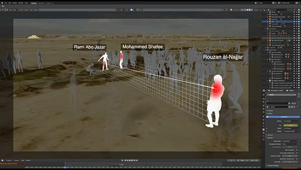208年6月1日,在加沙南部的汗尤尼斯附近的一个地点抗议时,二十岁的医护人员Rouzan al-Najjar被一名以色列狙击手射杀。我们同步了可用的视频素材,绘制了每个摄像机的运动以模拟个人的位置,并建立一个可能的“弹道锥束”。