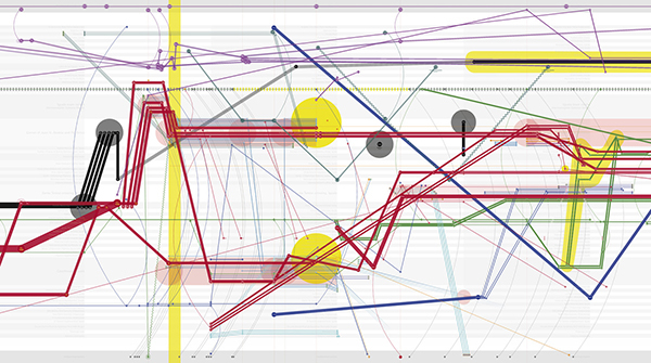 这张图片是2017年墨西哥非政府组织Centro Prodh和墨西哥城墨西哥国立自治大学当代艺术博物馆(MUAC)的大型调查的一部分,描绘了各方关于2014年9月26日至27日在墨西哥伊瓜拉的43名学生失踪的不同叙述。数据挖掘了数千页与此事件相关的报告,将每个当事人在时间和空间上定位,检视电话里的枪声和汽车运动的关系,图表是关于失踪的所有叙述的地图。它揭示了误导性极强的国家叙事(标黑),也被不祥地称为“历史事实”,与我们参与的幸存者和NGO的证词(标红)的分歧。它的复杂性使图像成为学生们仍然缺失的矛盾版本的迷雾。它表明此次失踪不仅是身体的失踪,证据也不翼而飞。