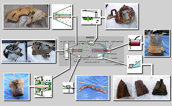 2017年10月,出现了几篇关于2017年3月30日在拉米那发生叙利亚空军沙林毒气袭击事件的报道。在试图否认发生叙利亚化学武器袭击事件时,俄罗斯外交部无意中泄露了几页包含了叙利亚军火库中几种化学武器详细图纸的幻灯片。在这个可被描述为“开源考古学”( open source archaeology)的过程中,我们与Bellingcat的研究人员一起构建了一个炸弹的3D模型,比对已发现的碎片,核证出拉米那空袭确实使用了化学弹药。