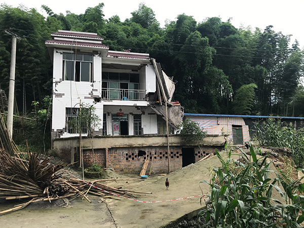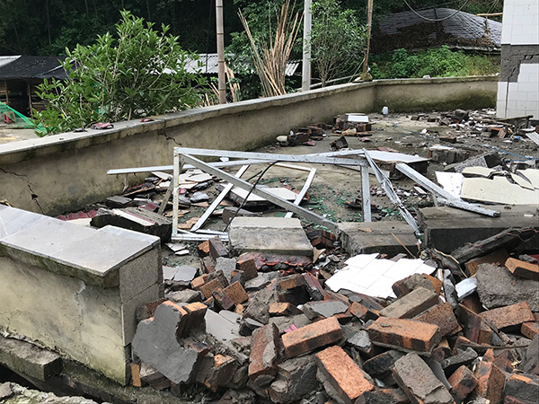 “当时很危险,垮的时候四个人都在门前坝子上,我当时拿着电筒去看,有一边房子垮了。”