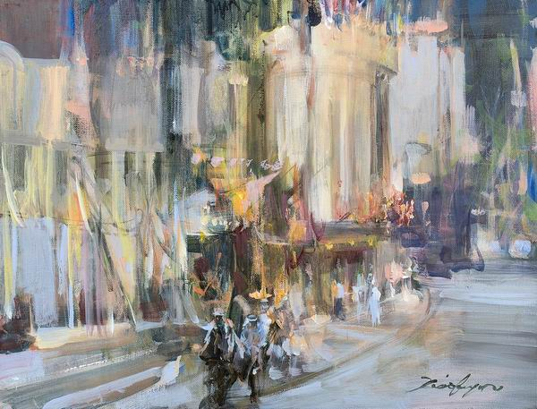 陈燮君的作品还有《圆明园路风情街》。圆明园路是上海这个繁华拥挤的城市里宁静而又不失典雅的一角,南起北京东路,北至苏州路。1860年代,由上海公共租界工部局修筑此路。 陈燮君告诉记者,自己曾在圆明园路住了55年,绘画这里的建筑就如同自己的家,“对这里的历史感、沧桑感都比较清晰。朝阳、晚霞时,它就是如此鲜艳。”