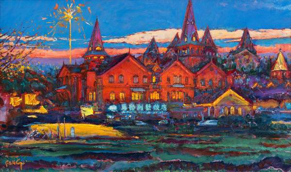 进入展厅,首先能看到的便是艺术家方世聪以鲜艳的笔调描绘的马勒别墅。马勒别墅,又称“马勒住宅”,位于陕西南路,建于1927年,主人是英籍犹太人马勒。这栋欧式建筑,尖塔高耸、屋顶陡翘,外形凹凸变化奇致,主建筑为三层斯堪的那维亚式挪威风格建筑,宛如一座欧式华丽的小宫殿,外墙为赭红色,中嵌彩色瓷砖,屋顶是黄绿色琉璃瓦,整幢别墅掩映在绿树丛中,色彩搭配别具一格。方世聪告诉记者,画马勒别墅可不容易,“来来往往去了6次,但不想只表达写生,配以观察到的夜晚灯光,画了记忆中的建筑。”