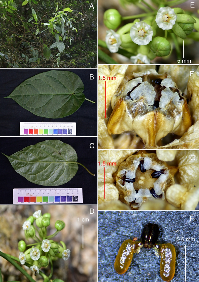 2018年11月,中国科学院西双版纳热带植物园园林园艺部工作人员申健勇、王文广、马兴达等在西双版纳州勐海县开展“西双版纳地区本土植物全覆盖保护计划”目标植物调查工作时,发现一鹅绒藤属疑似新种,该种形态上与豹药藤(Cynanchum decipiens)、短柱豹药藤(Cynanchum longipedunculatum)相似,但该种花序梗很短(1.8–2.2 cm),叶子卵圆形(12–20 × 6–11 cm),花瓣绿色且于花期反折,副花冠碗状且高于合蕊冠,以上特征可以和前两种明显区别开。通过查阅文献和相近种模式标本对比,最终确认该物种为一新种,并根据它的短总花梗命名为短梗豹药藤(Cynanchum brevipedunculatum J. Y. Shen),并以Cynanchum brevipedunculatum, a new species of Apocynaceae from Yunnan, China 为题,在线发表于国际学术期刊Taiwania上。