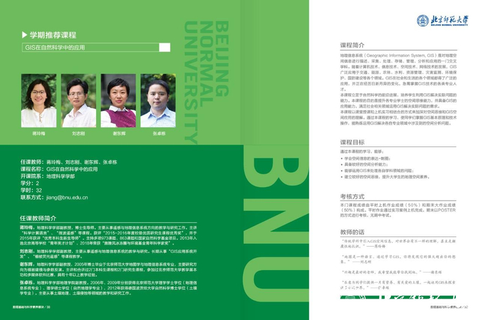 该课程依托地理科学学部雄厚的GIS学科优势,遥感科学国家重点实验室、环境遥感与数字城市北京市重点实验室等平台支撑,拥有丰富授课经验以及扎实专业知识的教师团队。“GIS在社会科学的应用”和“GIS在自然科学的应用”课程的开设,立足于科学的前沿发展,旨在提升各专业学生的空间思维能力,使学生掌握GIS基本原理和技术操作,最终能够将GIS运用到各自学科领域。在课程准备阶段,课程教学团队广泛学习国际先进教学经验,充分探讨教学方案,研究制定了教学大纲、实习案例、结业方式、大作业数据和内容,最终确定以海报(poster)展示+讲解的方式进行课程考核。