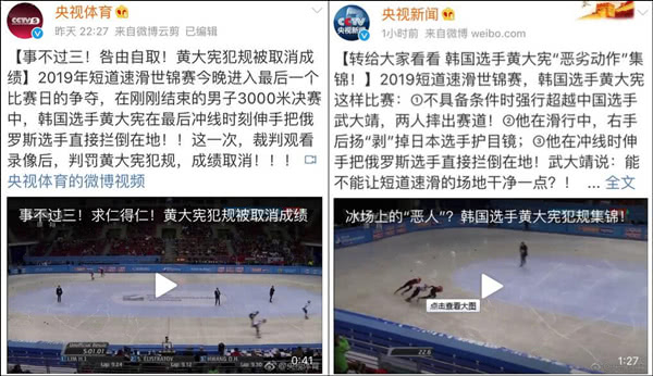 很多中国网友认识黄大宪,是因为他在今年世锦赛期间的3次扰乱他人的“恶劣动作”,当时@央视新闻 还把这三次“出手”做成了精彩的“恶劣动作”集锦,怒骂其是“冰场上的恶人”。