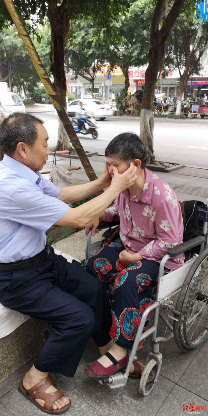 摊位附近的老人介绍,江山华每天都会来,当自己在上班一样不缺席,每天两个小时,江山华几乎没有间断过,“老夫老妻,亲力亲为的老公还是很少见”。