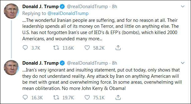 “伊朗今天发表的非常无知和侮辱性的声明,只表明他们不了解现实。伊朗敢动美国一根毫毛,都将遭到强大势不可挡的力量反击。在某些地区,势不可挡意味着毁灭。不会再有约翰·克里和奥巴马了!”