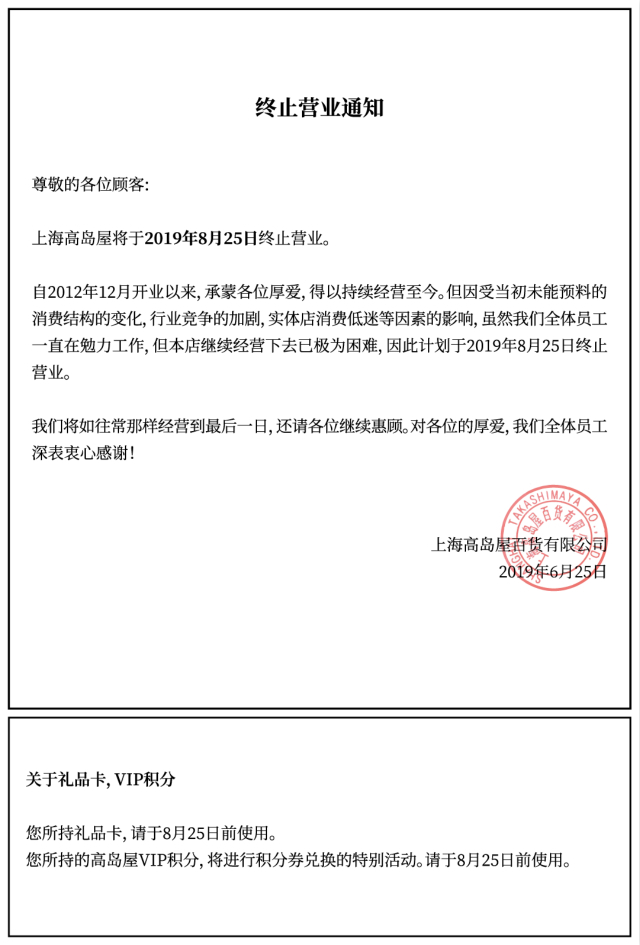 对于此次上海高岛屋的关店决定,在《终止营业的通知》中其官方表示,受当初未能预料到的行业竞争加剧、实体店消费低迷等因素影响,虽然一直在勉力工作,但该店继续经营下去已极为困难,因此计划于2019年8月25日终止营业。