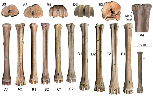 图3. 泥河湾山神庙咀遗址新发现的布氏真枝角鹿掌、蹠骨化石及与梅花鹿蹠骨(F)的比较(同号文供图)