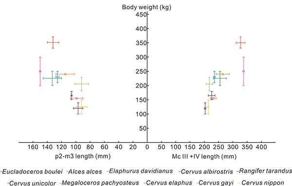 图4. 从下颌齿列及掌、蹠骨长度对布氏真枝角及其它鹿类进行的体重估算(张贝供图)