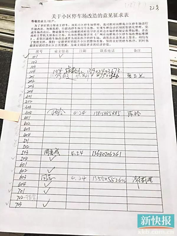 记者在业主拍摄的征求意见表上看到,表单上并未列明具体的收费标准,只标注了房号、业主签名、联系电话、备注几个项目。其中一些业主的签名栏上填充的内容为“√”。
