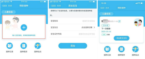 输入宝贝信息后,首页显示下一次接种疫苗的时间和疫苗种类。其中,“接种记录”会显示宝贝已经接种过的(从出生至最近)疫苗信息;“接种程序”提供宝宝从出生至6周岁的疫苗接种的参考流程(仅供参考,具体以预防接种本上信息为准);“接种站点”显示全市提供儿童接种的门诊地址、电话,家长们可以按区查询。