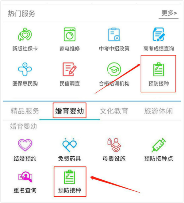 打开“随申办”App,在“我”频道的“热门服务”中进入“预防接种”服务,或者点击“更多”后从“婚育婴幼”版块进入“预防接种”服务,家长们输入宝贝信息,即可查询疫苗接种信息。