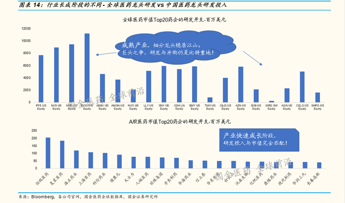 国金证券研究所在研报中表示,全球医药巨头的市值与其研发投入排序并不完全匹配,成熟市场的一些细分领域已经可以稳定享受龙头溢价。但是,顶尖龙头依然必须在绝对研发开支与领先科技的并购上重磅比拼。 国金证券分析师赵海春认为,中国医药产业已经度过萌芽期,开始步入成长,头部企业市值与其研发开支排序的完美匹配就是一个有效印证:谁创新投入多谁就先突破。