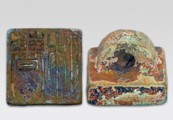 2009年、河南省洛阳市孟津県曹休墓出土,洛阳市文物考古研究院蔵。曹休,字文烈,沛国谯(今安徽亳州)人。三国曹魏将领,曹操族子。他于曹操起兵讨伐董卓时前往投奔,被称为“千里驹”。曹操对他如同亲子,并使他领虎豹骑宿卫。在曹休墓后室出土铜印1枚,为边长约2.0cm、篆书白文“曹休”二字的私印,成为墓主人身份的确切证据。