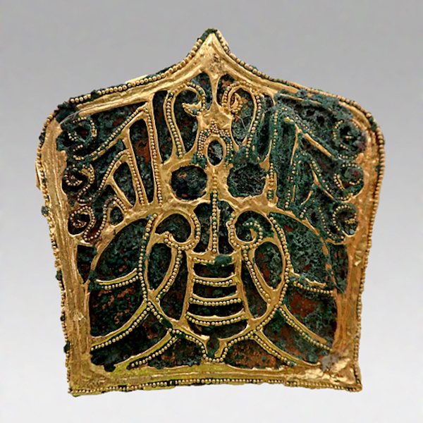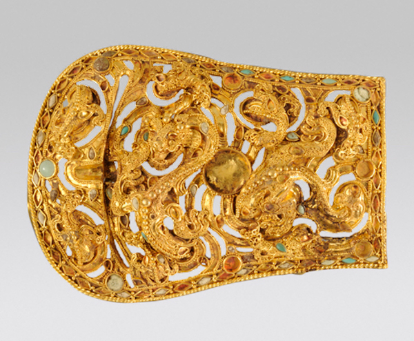 2003年、山东省临沂市王羲之故居洗砚池1号墓出土,临沂市博物馆蔵。这是贵族戴在头顶的贵族装饰品,准确无误镶嵌在上的金颗粒呈现了工匠超级熟练的技术。
