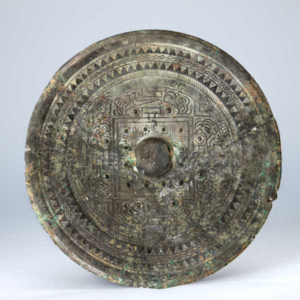 1955年、辽宁省辽阳市三道壕1号壁画墓出土,辽宁省博物馆蔵。中国挖掘的镜子的例子很少,例如在图案的最外侧存在突出的线条,并且它们具有在日本列岛上挖掘的三角形边缘怪物中识别的特征。
