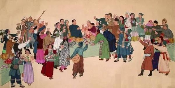 从50年代开始,长征路上的写生开启了另外一个对于民族的表述,反映对西部的憧憬,暗含整个国土和国家统一的意识,通过风景画反映了一个国家的意识。后来画中对多民族团结的表达越来越深入,表达其欣欣向荣,充满着时代的欣喜和欢乐,这也构成了1960年代绘画中对各民族的基本表达。1964年起侯一民、邓澍的设计的年画累计印刷发行1500万张,画面有57个人,除了毛泽东有56个,这是第一次把56个民族都表现出来了。